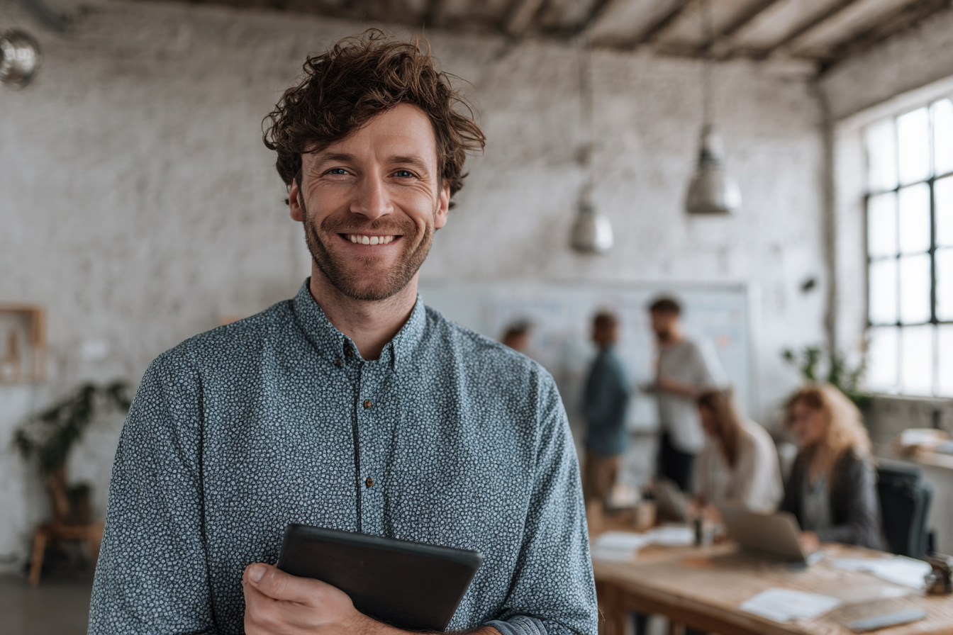 Confident young creative professional with a bold look, standing in a modern open-plan office. She has short platinum blonde hair, wears black-framed glasses, hoop earrings, and a sleeveless white top. Her arms, neck, and hands are covered in distinctive tattoos, and she holds a closed laptop against her chest. The setting includes minimalist workstations, ergonomic chairs, and a clean, contemporary aesthetic. 8K realistic photography, detailed skin texture, edgy fashion style, natural lighting, creative tech workspace, strong and expressive portrait composition.
