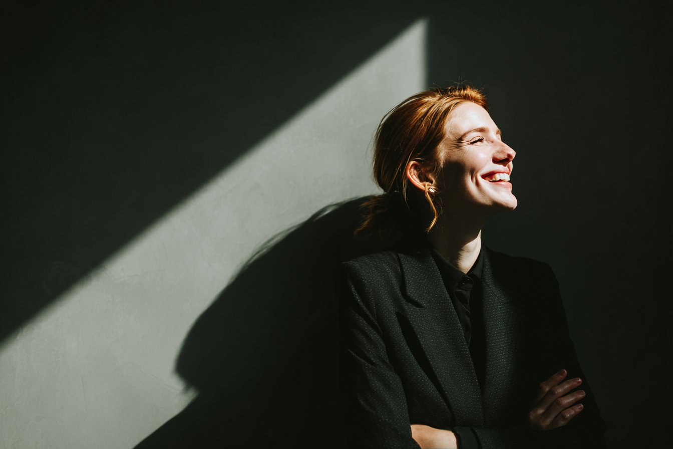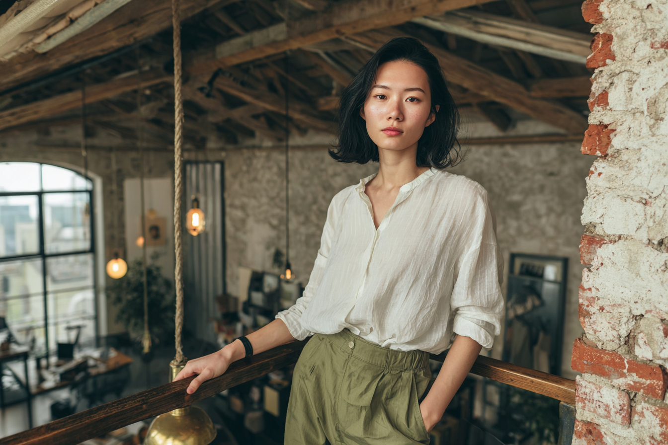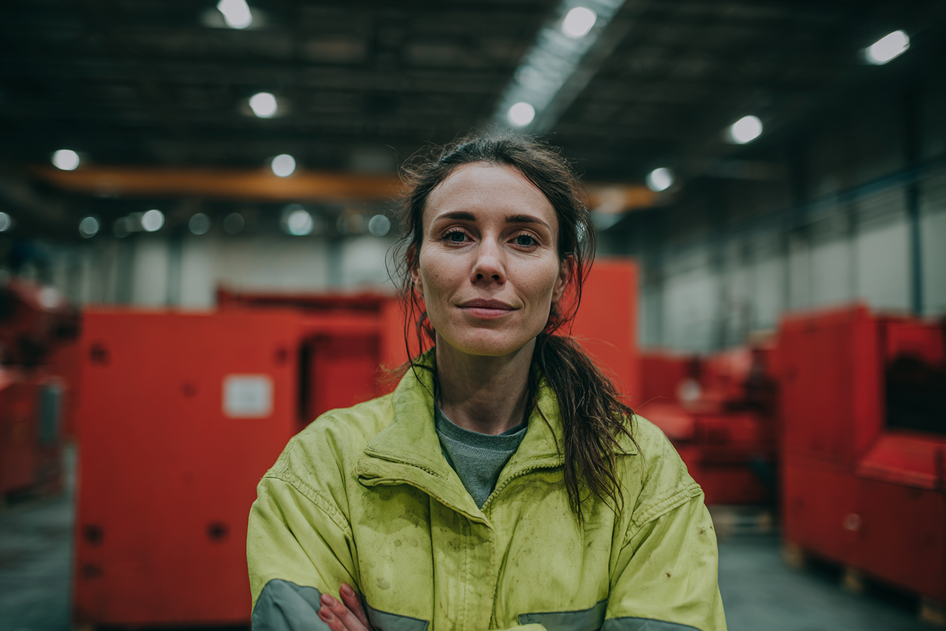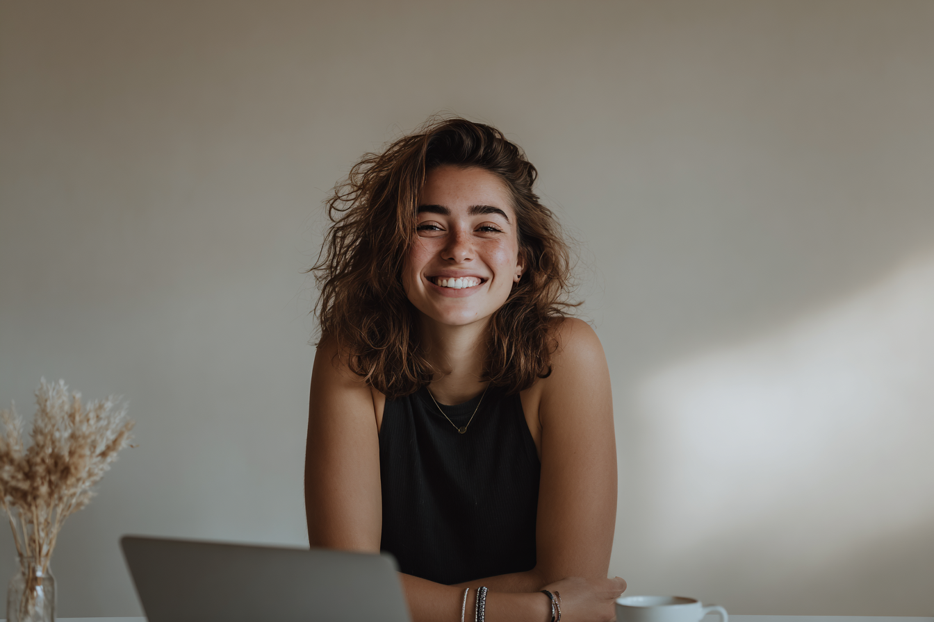 Confident young creative professional with a bold look, standing in a modern open-plan office. She has short platinum blonde hair, wears black-framed glasses, hoop earrings, and a sleeveless white top. Her arms, neck, and hands are covered in distinctive tattoos, and she holds a closed laptop against her chest. The setting includes minimalist workstations, ergonomic chairs, and a clean, contemporary aesthetic. 8K realistic photography, detailed skin texture, edgy fashion style, natural lighting, creative tech workspace, strong and expressive portrait composition.